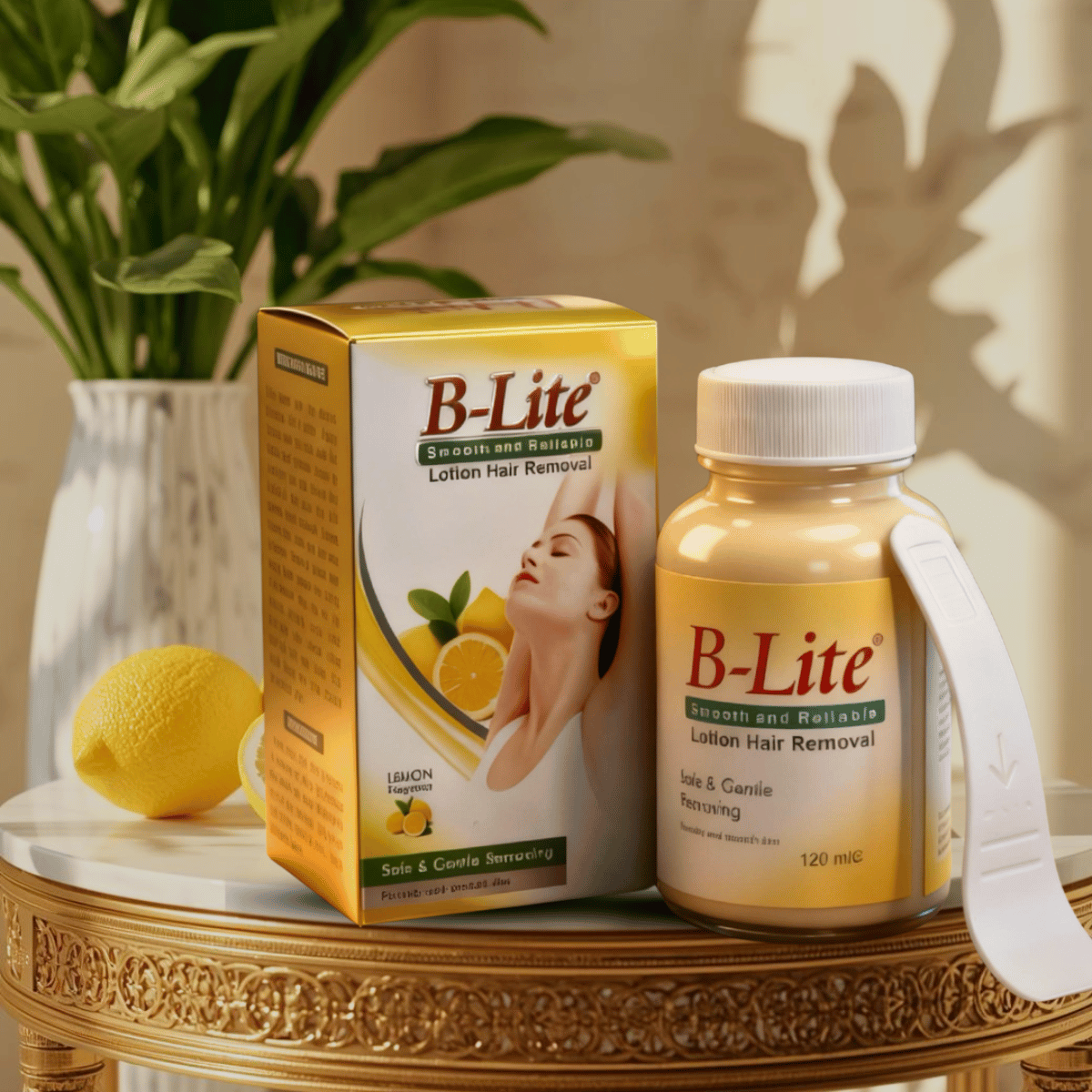 B-Lite Hair Removal Lotion with Lemon gently removes unwanted hair while leaving skin smooth, soft, and refreshed. Enriched with natural lemon extract, it helps brighten and cleanse the skin for a fresh, radiant feel.